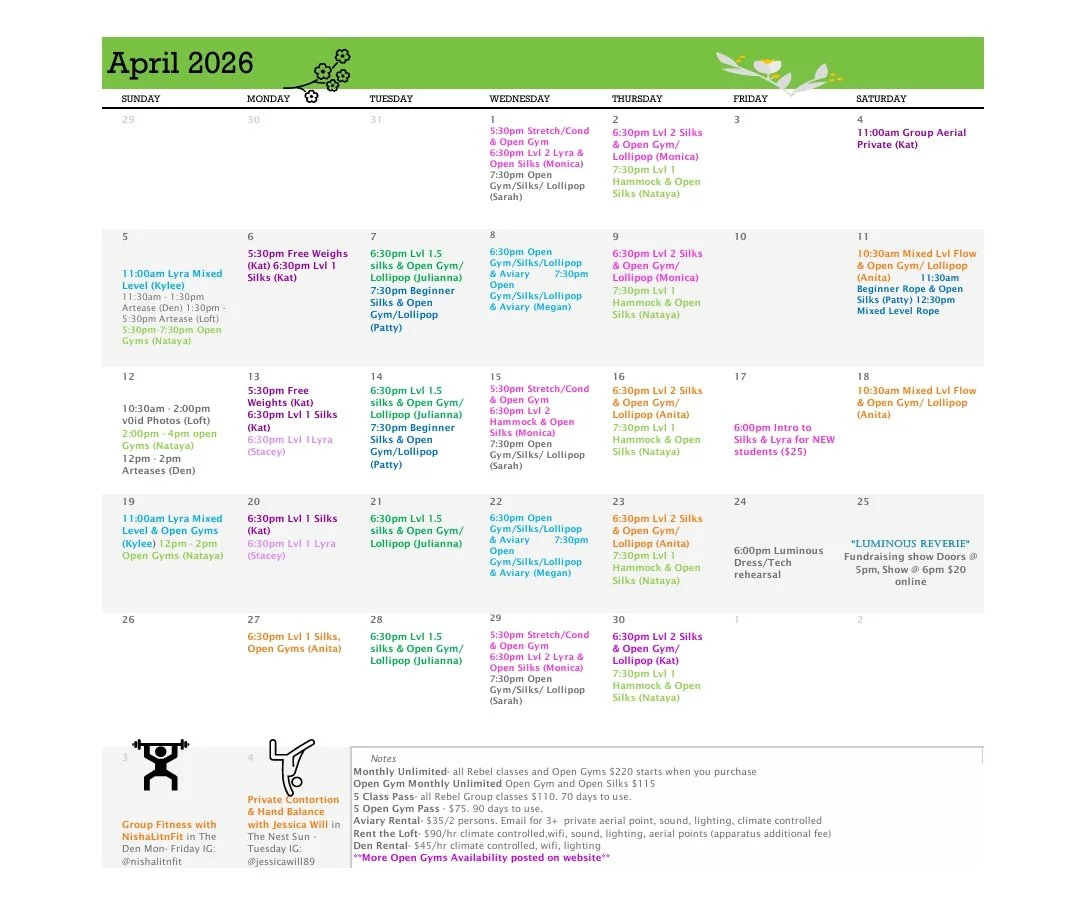 To cancel, reschedule, or contact please do so only through website or email at Rebelaerial.artistry@gmail.com Please note as a reminder of our policy that single class sessions, single Open Gym sessions, workshops, and introductory specials are non-refundable. For cancellations done before the 4 hour cutoff: in order to keep your credit, please reschedule for a like class. If you'd like to use your credit for a different level or apparatus, email us and we will manually reschedule you.